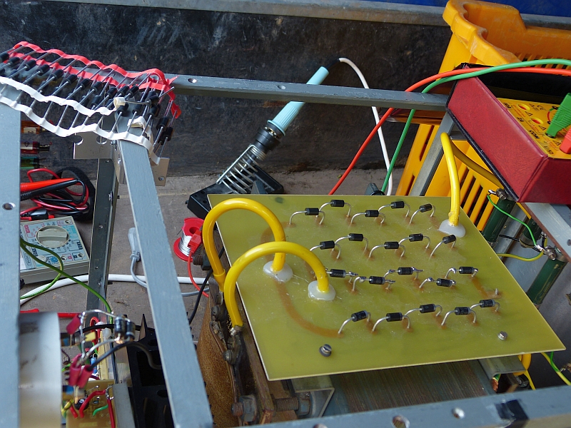 Leider haben wir am Bollenberg keinen Netzanschluss. Aber es blieben ja noch zwei Tage um ein passendes Einphasennetzteil für die PA zusammen zimmern zu können. Es wäre wohl auch mit der von mir schon einmal eingesetzten SB1000-Netzteilversion gegangen, da ich aber erst vor kurzem einem abgerauchten Transformator einer solchen PA ins Auge gesehen hatte, zog ich es vor, auch in Anbetracht der zu erwartenden Dauerbelastung, dafür einen weniger empfindlichen Transformator aus meinem Fundus einzusetzen. So nebenbei entpuppten sich dann auch noch die zunächst eingesetzten acht Glättungskondensatoren aus dem letzten Jahrtausend (1970) als Quelle möglichen Unheils, da sie im ersten Probebetrieb nach einigen Minuten an Spannung unangenehme knisternde Geräusche von sich gaben, den großen Knall wartete ich dann aber besser nicht mehr ab. Ausgebaut verfügten sie dann immer noch über eine respektable 'Restwärme', also nur noch Schrottwert. Glücklicherweise befanden sich noch drei standhafte Kondensatoren in meinem Besitz, der angebenen Spannungsfestigkeit von >5KV wegen, hatten sie einmal wahrscheinlich in Defibrillatoren Leben gerettet. Unerwartete Schwierigkeiten bereitete auch die Schaltung für die Gittervorspannung. Eine von mir bereits mehrfach aufgebaute Schaltung mit einem Darlingtontransistor wollte einfach nicht überleben. Eine Modifikation der Schaltung und Ersatz des Darlingtons durch einen P-Kanal-Fet aus der Schachtel brachte dann die Erlösung. Bis heute weiss ich aber nichts über die Ursache für die Ausfallserie der Darlingtons. Sicherheitshalber steckte ich mir noch einen Ersatztransistor und einen Gurt Gleichrichterdioden ins Gepäck, wie sich zeigen sollte, ein weiser Entschluss. Eine augenscheinliche VDE Prüfung hätte der Aufbau am Ende wahrscheinlich auch nicht überstanden, aber er funktionierte elektrisch, zumindest bis ca. 2,5 Stunden vor Kontestende, als sich Teile der Gleichrichterkette aus unerfindlichen Gründen verabschiedeten. Doch Ersatzdioden waren ja glücklicherweise genügend dabei.