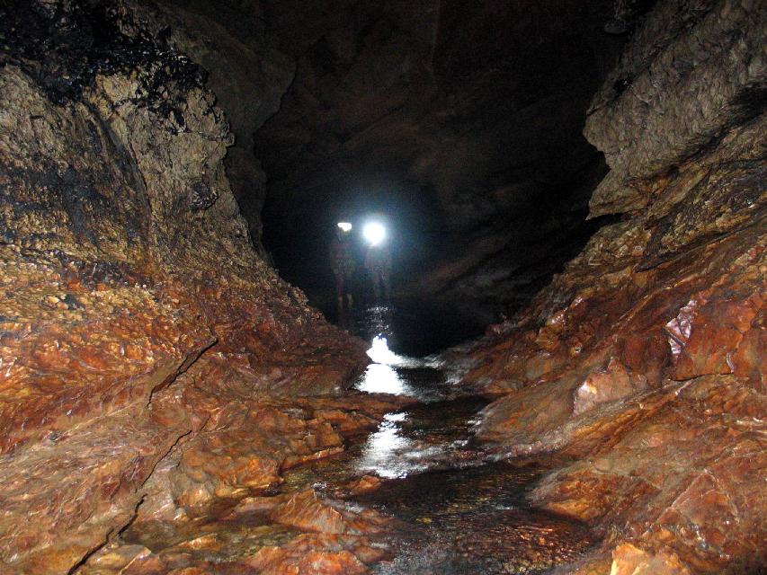 Am Ende der Traverse steigt man in den Wassergang ab und gelangt nach Überwindung eines Felsblocks zunächts in den Salle Nanette. Dem Gang folgend wird wieder das Bachbett erreicht, diesem abwechslungsreich durch Kolkstrecken bis zu einem von links einmündenden grossen Gang folgen, der über einen flachen Sinterfall betreten wird. Geradeaus syphoniert der Wassergang. Dem abzweigenden Gang folgend wird man nach einigen Minuten auf der rechten Seite eine Rampe mit deutlichen Begehungsspuren ausmachen, über die der Gang verlassen wird. Am Ende der Rampe knickt der Weg nach rechts ab. Nach der Passage eines einfachen Versturz steht man im grossen SalleChristian. Devaux. Es folgt ein Abstieg über eine Lehmflanke, die mit einem Seil versichert ist. Stets dem grossen geräumigen Gang folgend wird der Plage erreicht, ein Bereich mit deutlichen Sandflächen. Stets links haltend und dem Hauptgang folgend, wird ein deutlicher Kreuzungspunkt erreicht. Der Hauptgang steigt vor einem an und könnte durch die Überwindung eines kleines Aufstiegs, erleichtert durch eine künstliche Trittstufen in die Galerie des Aiguilles weiterbegangen werden. In Richtung Tripod muss  nach rechts in einen kleineren Gang mit niedriger Decke abgezweigt werden. Der Beginn der Passage ist recht lehmig und man muss sich deutlich bücken Wie Spuren zeigen, kann die Passage zu einem wassergefüllten Schlammbecken ausarten. Kurz darauf wird ein Saal erreicht, der geradeaus  rechts verlassen wird. In einem Knick muss eine kleine Stufe nach links überwunden werden, ein trockener Gang mit lauter werdenden Wassergeräuschen führt zu einer Abzweigstelle, bei der der rechte (ist auch bezeichnet) Gang zu einer Abseilstelle in den aktiven Höhlengang leitet. Ein festeingebautes Seil mit einer parallelen Leiter führt in den aktiven Höhlenteil, der flussaufwärts begangen wird. Nach ca. hundert Metern  zweigt nach links ein Gang ab, der steil nach oben führt und über einen Sinterfall erklettert wird. Nach einem Aufstieg wendet sich der trockene fossile Gang nach rechts und man folgt ihm leicht, bis Geräusche den Puit de Legionaire ankündigen. Hier wird wieder ca. 11m an einem festeingebauten Seil in den aktiven Höhlenteil abgeseilt.  Dem Gang  folgend, verstürzt dieser  im weiteren Verlauf . Der Versturz kann kriechend überwunden werden. Hinter dem Versturz folgt man leicht dem aktiven Höhlenteil bachaufwärts. Nach einigen Kehren wird der deutliche Abzweig in den Salle de Petit Negro erreicht, der von links oben  in den aktiven Höhlengang einmündet. Trotz genauerem Umsehens, konnten wir leider den Tripod, der sich in diesem Bereich der Höhle befinden soll, nicht entdecken.